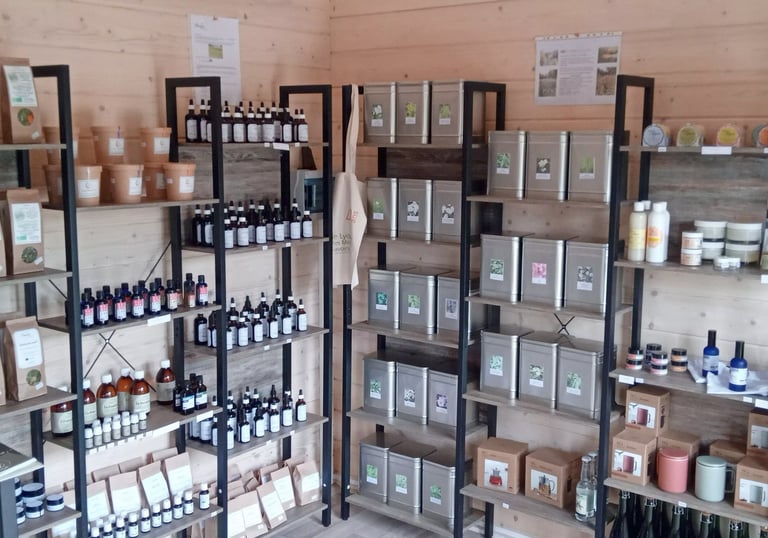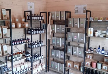 Simpl'essens c'est aussi une petite boutique emplie de bonnes odeurs où sont proposés des plantes et des produits qui en sont dérivés d'excellente qualité, choisis avec soin et dans un souci de protection des ressources.